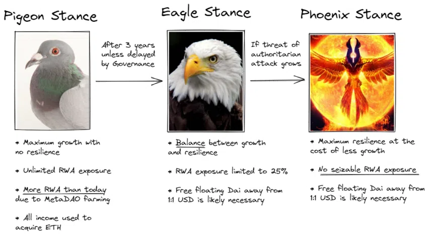 โปรโตคอลจะเริ่มด้วย Pigeon Stance ในขั้นต้นเพื่อสะสม ETH เพื่อทำให้ DAI มีความยืดหยุ่นต่อภัยคุกคามต่างๆ ต่อหลักประกัน RWA จากนั้น มันจะเข้าสู่ช่วงการเปลี่ยนเฟสไปสู่ Eagle Stance หลังจากที่มีหลักประกันแบบกระจายอำนาจถึง 75% จากการสะสม ETH สุดท้ายคือ Phoenix Stance ที่จะไม่มีหลักประกัน RWA ที่จับต้องได้