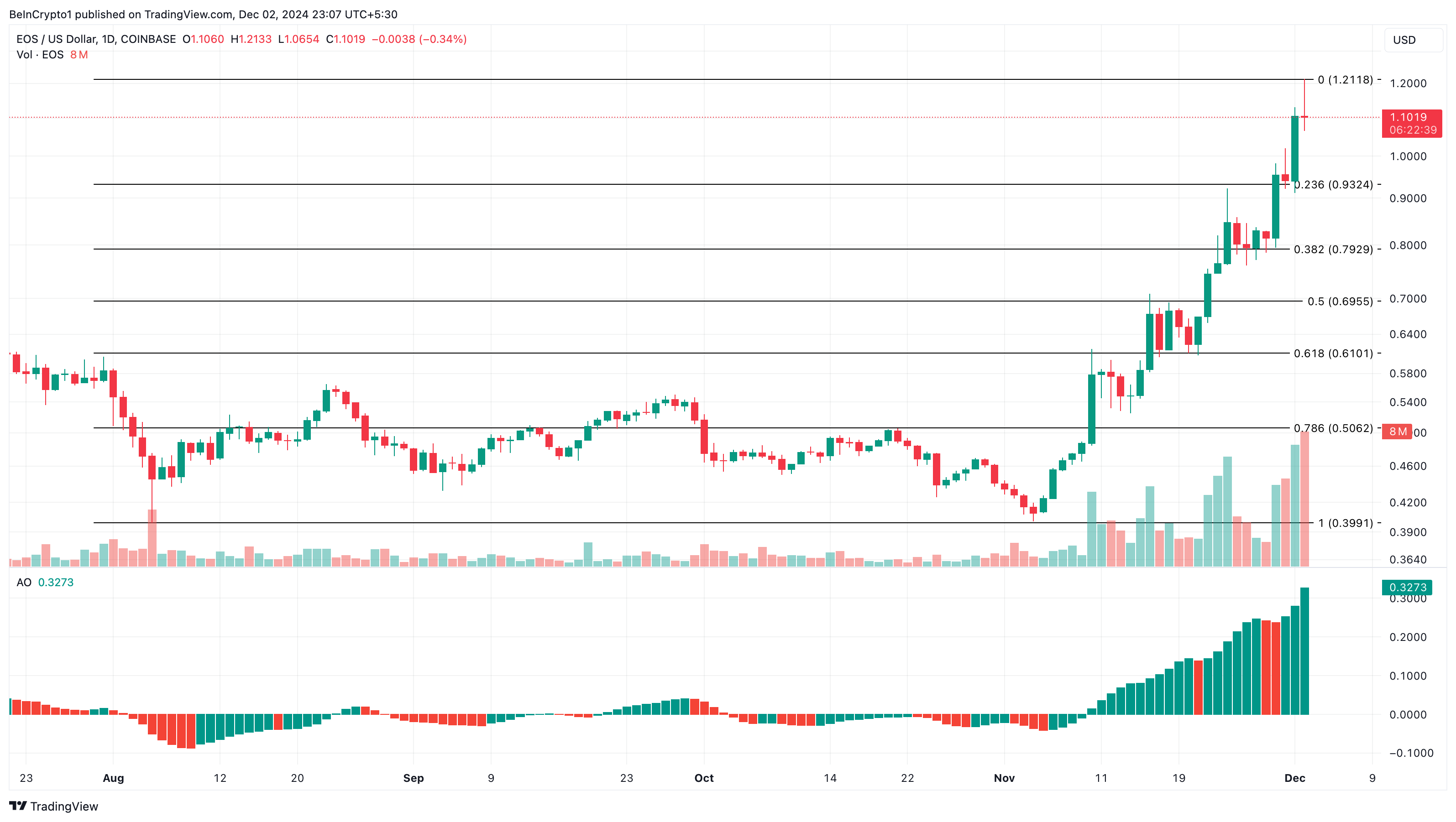 เมื่อวันที่ 4 พฤศจิกายน ราคาของ EOS อยู่ที่ 0.42 ดอลลาร์ อย่างไรก็ตาม ณ เวลาที่เขียนนี้ ราคาขึ้นไปถึง 1.12 ดอลลาร์ แสดงให้เห็นว่า altcoin มี ความต้องการเพิ่มขึ้น ในช่วงไม่กี่สัปดาห์ที่ผ่านมา แม้ว่าโครงการจะไม่มีการพัฒนาที่สำคัญที่ขับเคลื่อนการพุ่งขึ้น แต่ดูเหมือนว่าความสนใจที่เพิ่มขึ้นใน coin ที่ค่อนข้างเก่าได้มีบทบาทในการเพิ่มขึ้นนี้
