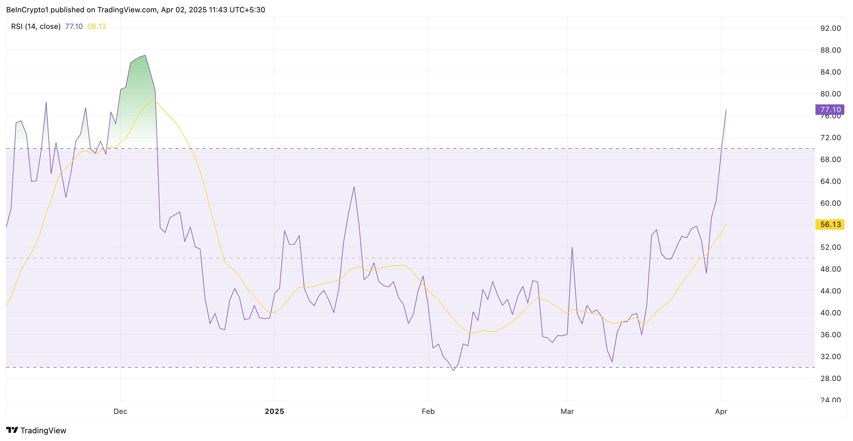 ที่ 77.10, RSI ของ EOS แสดงสัญญาณการซื้อมากเกินไป ซึ่งบ่งชี้ว่าผู้ซื้อ EOS อาจเผชิญกับความเหนื่อยล้าในไม่ช้า ทำให้ผู้ขายสามารถ กลับมาครองตลาด และกระตุ้นการปรับฐานในแนวโน้มปัจจุบัน