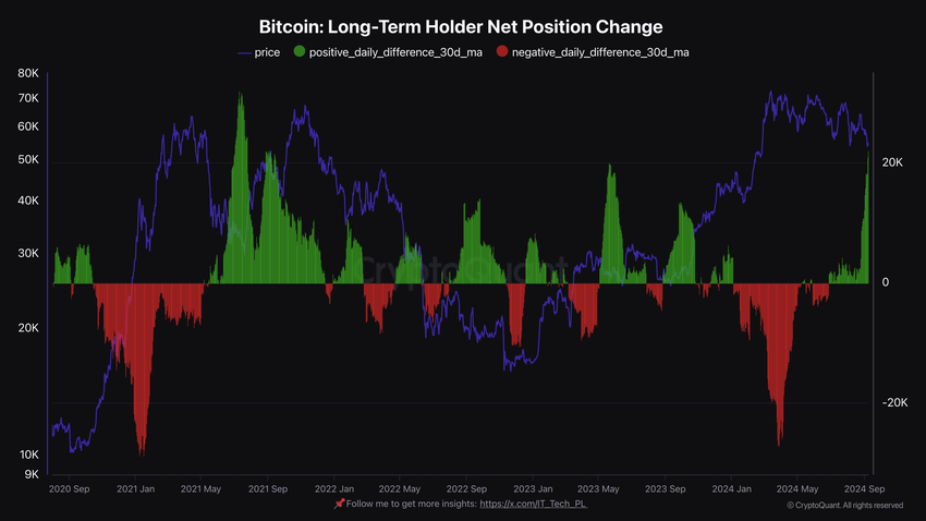ในเวลาเดียวกัน ผู้ถือระยะยาว (LTH) กำลังเพิ่มตำแหน่ง Bitcoin ของพวกเขา ข้อมูลเปิดเผยการเพิ่มขึ้นของตำแหน่ง LTH ซึ่งโดยปกติเป็นสัญญาณที่เป็นบวก การสะสมของนักลงทุนระยะยาวมักบ่งบอกถึงความมั่นใจในศักยภาพการเติบโตในอนาคตของสกุลเงินดิจิทัล