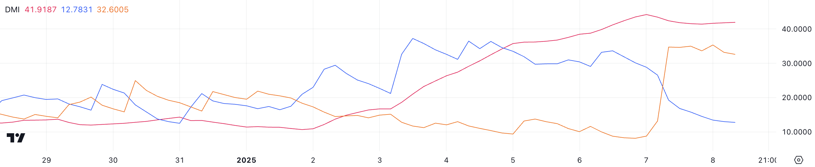 Ethereum Average Directional Index (ADX) ปัจจุบันอยู่ที่ 41.9 สะท้อนถึงแนวโน้มตลาดที่แข็งแกร่ง ADX เป็นตัวบ่งชี้ทางเทคนิคที่วัดความแข็งแกร่งของแนวโน้ม โดยไม่คำนึงถึงทิศทาง ในระดับจาก 0 ถึง 100 ค่าเหนือ 25 บ่งชี้ถึงแนวโน้มที่แข็งแกร่ง ขณะที่ค่าต่ำกว่า 20 ชี้ถึงแรงขับเคลื่อนที่อ่อนแอหรือไม่มี