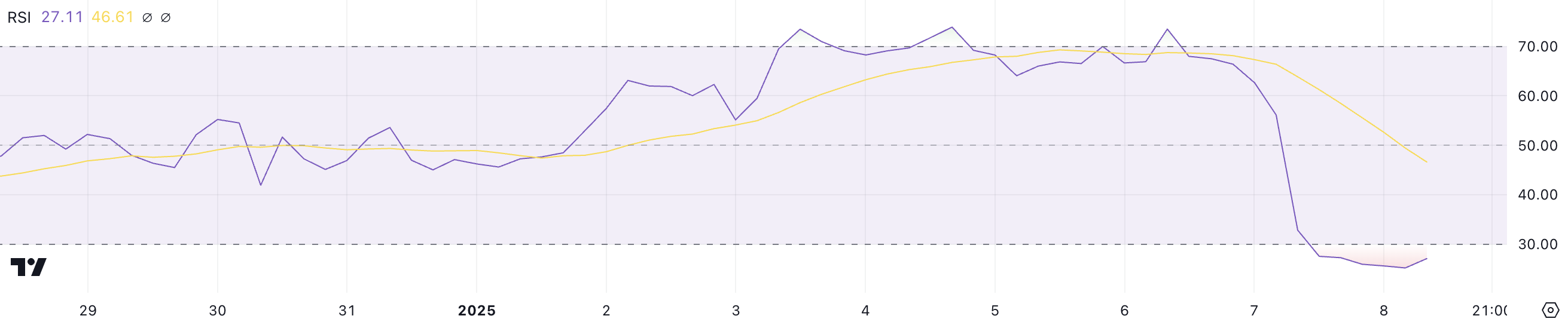 ดัชนีความแข็งแกร่งสัมพัทธ์ (RSI) ของ Ethereum ลดลงเหลือ 27.1 ซึ่งเป็นการลดลงอย่างรวดเร็วจาก 66.3 ภายในวันเดียว RSI เป็นตัวบ่งชี้ทางเทคนิคที่วัดความเร็วและขนาดของการเคลื่อนไหวของราคาในระดับจาก 0 ถึง 100