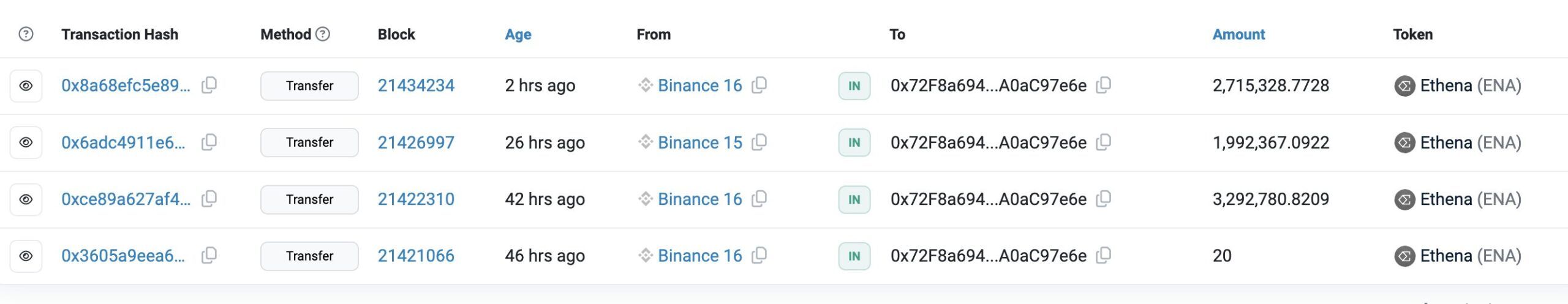 น่าสนใจที่ WLFI ไม่ใช่หน่วยงานใหญ่เพียงแห่งเดียวที่สะสม ENA ตามข้อมูลจาก Lookonchain วาฬคริปโตที่มีชื่อเสียงได้ ซื้อโทเค็นจำนวน 8 ล้านเหรียญ มูลค่า 9.20 ล้าน USD จาก Binance และโอนพวกมันไปยังวอลเล็ตที่ไม่ใช่ของตลาดแลกเปลี่ยน.