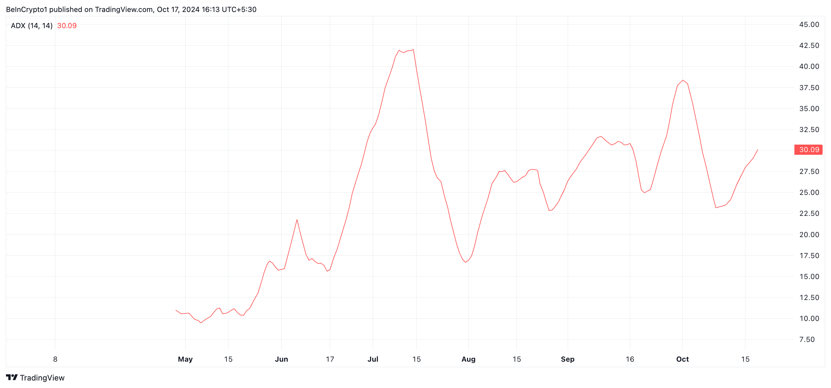 มีค่าตั้งแต่ 0 ถึง 100 โดยค่าที่เหนือกว่า 25 บ่งชี้ถึงแนวโน้มที่แข็งแกร่ง ในขณะที่ค่าต่ำกว่า 20 บ่งชี้ถึงแนวโน้มที่อ่อนแอ ด้วยค่า ADX ที่ 30.09 และกำลังเพิ่มขึ้น การรวมราคาของ ENA แข็งแกร่งและอาจยั่งยืนได้ตราบใดที่ความต้องการยังคงอยู่