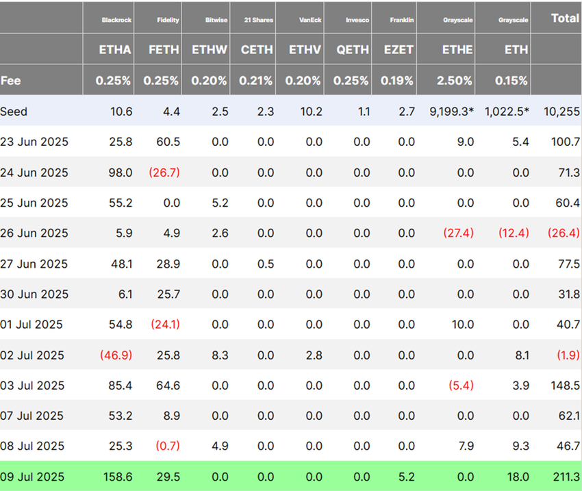 ผู้จัดการสินทรัพย์นี้คิดเป็นกว่า 75% ของการไหลเข้ามูลค่า 211.3 ล้าน USD Fidelity’s FETH อยู่ในอันดับสองที่ห่างไกลด้วยมูลค่า 29.5 ล้าน USD ตามด้วย Grayscale’s ETH ที่ 18 ล้าน USD