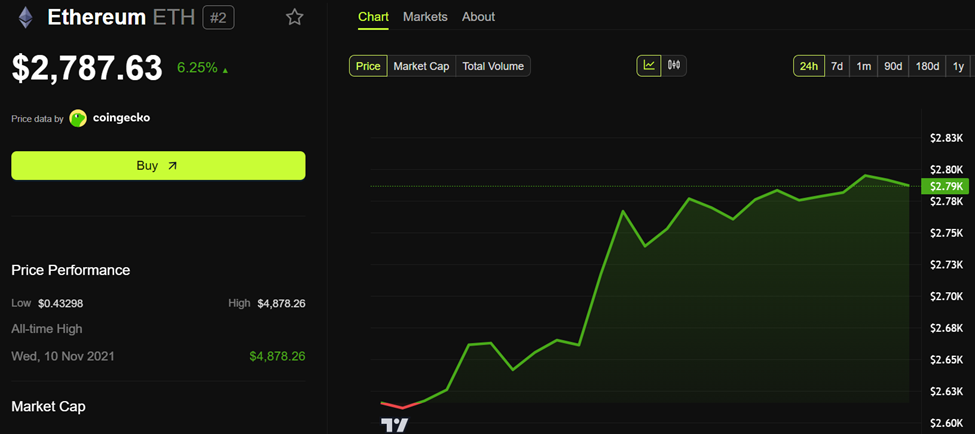 ณ ขณะที่เขียนบทความนี้ Ethereum ซื้อขายอยู่ที่ 2,787 USD เพิ่มขึ้นกว่า 6% ในช่วง 24 ชั่วโมงที่ผ่านมา