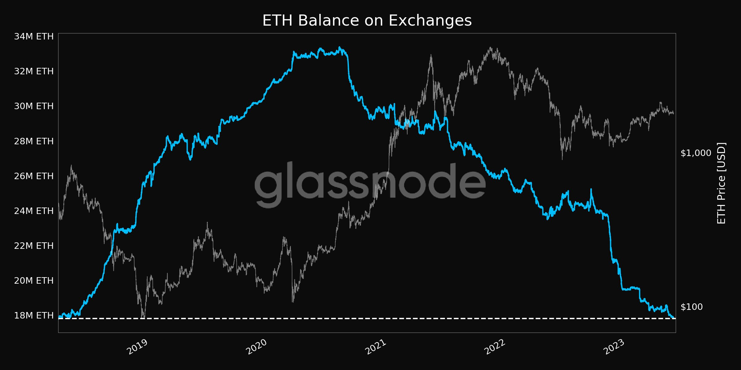 ตามข้อมูลของ Glassnode ปริมาณของ Ethereum ในแพลตฟอร์มคริปโตแบบรวมศูนย์ลดลงสู่ระดับต่ำสุดในรอบ 5 ปี
