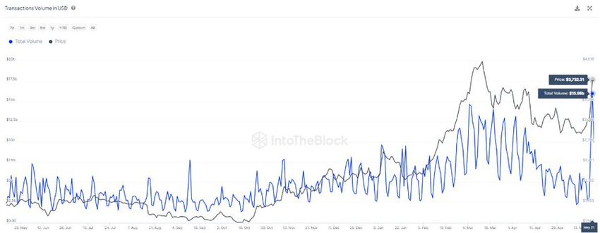 โดยเฉพาะอย่างยิ่ง ETH กําลังประสบกับ กิจกรรมของสถาบันที่เพิ่มขึ้น แพลตฟอร์มการวิเคราะห์ Blockchain IntoTheBlock รายงานว่า ความคาดหวังเกี่ยวกับการอนุมัติ Ethereum ETF ผลักดันปริมาณการซื้อขายบนเครือข่ายสู่ระดับสูงสุดในรอบสองปีที่ 15.98 พันล้านดอลลาร์