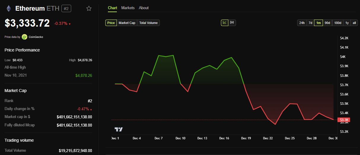 ข้อมูลจาก BeInCrypto แสดงให้เห็นว่า ETH ลดลง 0.37% ตั้งแต่เซสชันวันพุธเปิดขึ้น ณ เวลาที่เขียนนี้ ราคาของ Ethereum อยู่ที่ 3,333 USD