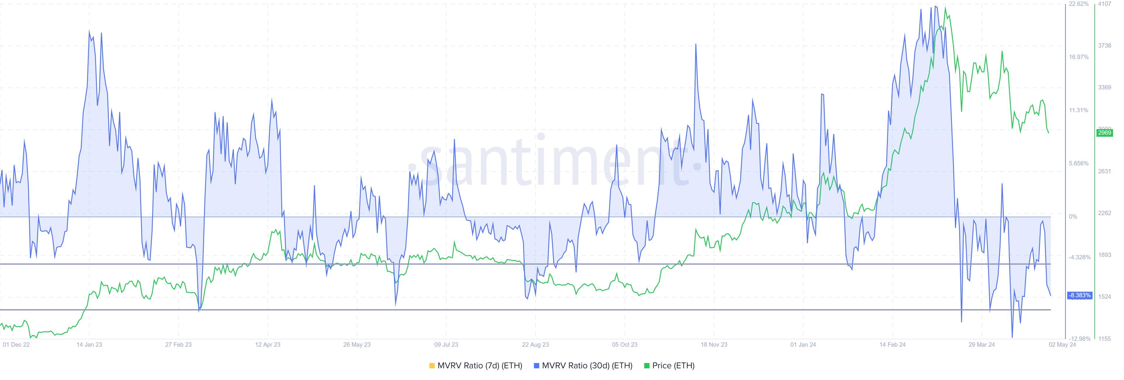 MVRV 30 วันของ Ethereum อยู่ที่ -8% ซึ่งส่งสัญญาณการขาดทุนและอาจกระตุ้นให้เกิดการสะสม ในอดีต การฟื้นตัวของ ETH เกิดขึ้นในช่วง -4% ถึง -10% MVRV ซึ่งระบุว่าเป็นเขตโอกาส