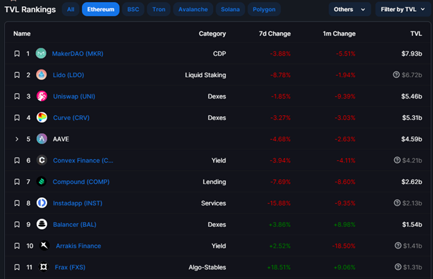 MakerDAO ซึ่งเป็น dApp ที่ใหญ่ที่สุดบน Ethereum สูญเสียมูลค่าไป 5.21% อยู่ที่ประมาณ 8 พันล้านดอลลาร์ Lido ซึ่งเป็นโปรโตคอลการ Stake สภาพคล่องซึ่งมี TVL มากกว่า 6 พันล้านดอลลาร์ มูลค่าลดลงถึง 1.8% กระดานเทรดแบบกระจายอำนาจ (DEX) เช่น Uniswap และ Curve Finance ก็ไม่ต่างกันเช่นกัน