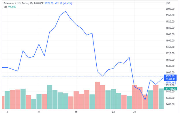 จากที่กล่าวมา เหรียญทะลุ 2,000 ดอลลาร์เป็นครั้งแรกนับตั้งแต่วันสุดท้ายของเดือนพฤษภาคม ในที่สุดมันก็แตะระดับสูงสุดประจำเดือนที่ 2,022.79 ดอลลาร์เมื่อวันที่ 14 สิงหาคม หลังจากต่อสู้กับราคาที่ลดลงอย่างมาก ETH ก็แตะระดับต่ำสุดประจำเดือนเดือนที่ 1,427.73 ดอลลาร์ในวันที่ 29 สิงหาคม ตลอดเดือนสิงหาคม มูลค่าของ Ether (ETH) ลดลง 7% จาก 1,681.45 ดอลลาร์ในวันที่ 1 สิงหาคมเป็น 1,553.68 ดอลลาร์ในวันที่ 31 สิงหาคม