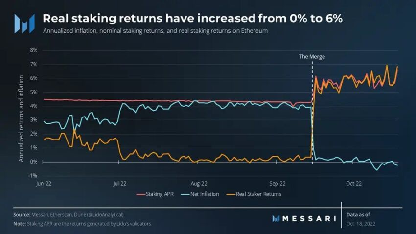 ผลตอบแทนจากการปักหลักของบริษัท ETH ยังไมเปลี่ยนแปลงอย่างมีนัยยะสำคัญเท่าที่ควร เนื่องจาก Maximal Extractable Value (MEV) ต่ำกว่าที่คาดโดยเฉพาะในภาวะ Bear Marketนี้ ตามข้อมูลจาก Messari การที่ผลตอบแทนเพิ่มขึ้นอย่างแท้จริงจาก 0% เป็น 6% นั้นจับต้องได้มากกว่าเนื่องจากอัตราเงินเฟ้อของ ETH ลดลงเหลือเกือบศูนย์จาก 4%