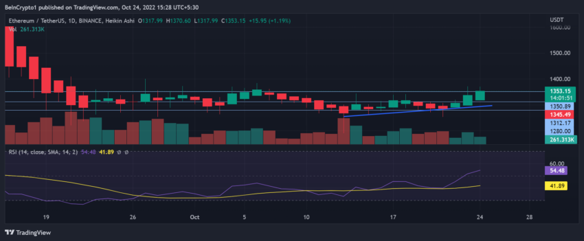 ในกราฟรายวัน ราคา ETH ปรับตัวขึ้นอย่างมาก โดยทำราคาไว้เหนือระดับแนวต้านที่ 1,315 ดอลลาร์สหรัฐ ทั้งนี้ ดัชนีความแข็งแกร่งสัมพัทธ์รายวันข้ามไปยังผู้ซื้อที่มีอํานาจเหนือกว่าโดยนําเสนอการเล่าเรื่องขาขึ้นสําหรับ ETH