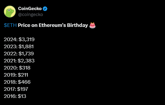 เนื่องจาก Ethereum ยืนอยู่เหนือราคา ICO ที่ 2,552.9% ที่ 0.13 ดอลลาร์ การเติบโตของมูลค่านี้สะท้อนให้เห็นถึงความเชื่อมั่นและความสนใจของนักลงทุนที่เพิ่มขึ้นเกี่ยวกับระบบนิเวศและแอปพลิเคชันที่มีศักยภาพ Vitalik Buterin ผู้ร่วมก่อตั้งเครือข่ายได้แบ่งปันเหตุการณ์สําคัญใน โพสต์ บน X ซึ่งนําสมาชิกในชุมชนไปสู่ทศวรรษหน้า