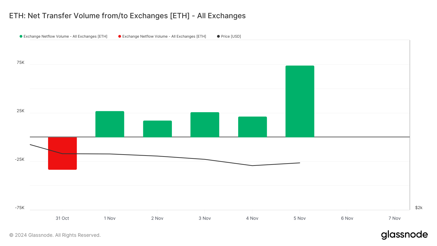 นอกจากนี้ แนวโน้มขาขึ้นล่าสุดของ Ethereum อาจพบกับความต้านทาน ตามที่ปริมาณการไหลเข้าออกของเหรียญในตลาดแลกเปลี่ยนแนะนำ การไหลเข้าออกของเหรียญวัดความแตกต่างระหว่างเหรียญที่เข้าและออกจากตลาดแลกเปลี่ยน