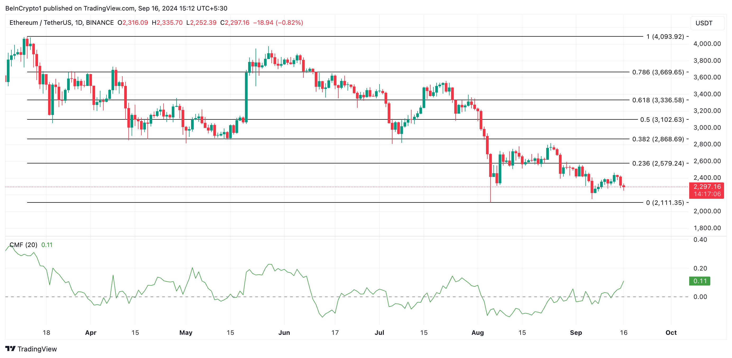 ในปัจจุบัน CMF ของ ETH ซึ่งวัดการไหลเข้าและออกของเงินในตลาดของมัน อยู่ที่ 0.12 แม้ว่าราคาของ ETH จะลดลงเมื่อเร็วๆ นี้ แต่ CMF ยังคงมีแนวโน้มเพิ่มขึ้น สร้างความแตกต่างในเชิงบวก สิ่งนี้บ่งชี้ถึงความต้องการซื้อ ETH ซึ่งอาจนำไปสู่การเปลี่ยนแปลงราคาในทางบวกในระยะใกล้