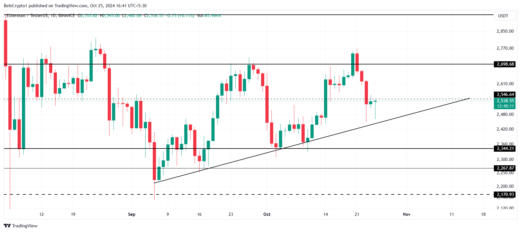 Ethereum ได้รักษาตัวอยู่เหนือเส้นแนวโน้มที่เพิ่มขึ้นมานานกว่าสองเดือน ซึ่งเสริมสร้างแนวโน้มโดยรวมที่เป็นบวก การรักษาระดับนี้จะทำให้ ETH ยังคงอยู่ในเส้นทางที่ดี แต่หากหลุดจากเส้นแนวโน้มนี้อาจนำไปสู่การลดลงไปที่ 2,344 USD การลดลงดังกล่าวอาจท้าทายแนวโน้มที่เป็นบวกและอาจนำไปสู่ความไม่แน่นอนของตลาดโดยรวมเกี่ยวกับทิศทางราคาของ Ethereum ในอนาคต
