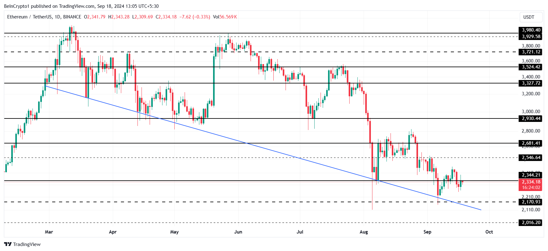 ราคาของ Ethereum ปัจจุบันมีการซื้อขายที่ 2,334 USD ซึ่งต่ำกว่าระดับต้านที่สำคัญที่ 2,344 USD ด้วยการขายที่ยังคงดำเนินต่อไปและสภาวะตลาดที่อ่อนแอลง การเพิ่มขึ้นสู่ 3,000 USD ดูเหมือนจะไม่น่าเป็นไปได้ในตอนนี้