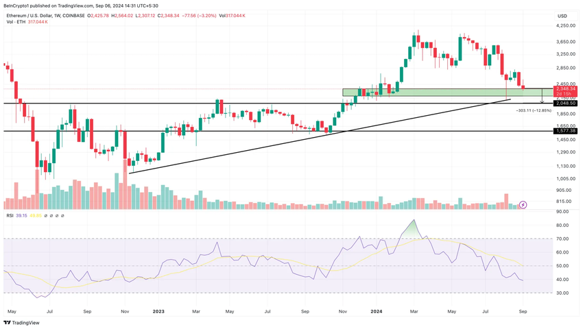 สกุลเงินดิจิทัลนี้มีราคาอยู่ระหว่าง 2,200 ถึง 2,350 USD โดยนักวิเคราะห์ทางเทคนิคของ BeInCrypto วิคเตอร์ โอลาเรวาจู รายงานว่าหากราคาตกต่ำกว่า 2,200 USD อาจนำไปสู่การลดลงของราคาอย่างมาก ซึ่งอาจ ทำให้ราคา Ethereum ตก ไปถึง 2,048 หรือแม้กระทั่ง 1,577 USD.