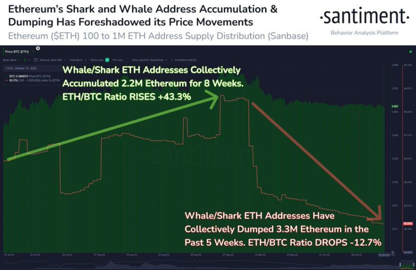 ตามที่บริษัทวิเคราะห์บล็อคเชน (Blockchain) ระบุว่า ETH Whale และ ETH Shark ได้ขาย Ethereum ทิ้ง คิดเป็นมูลค่า 4.2 พันล้านดอลลาร์สหรัฐฯ การออฟโหลดโทเค็นส่งผลอย่างมากต่อมูลค่าของ ETH เทียบกับ Bitcoin ในช่วงเวลาดังกล่าว