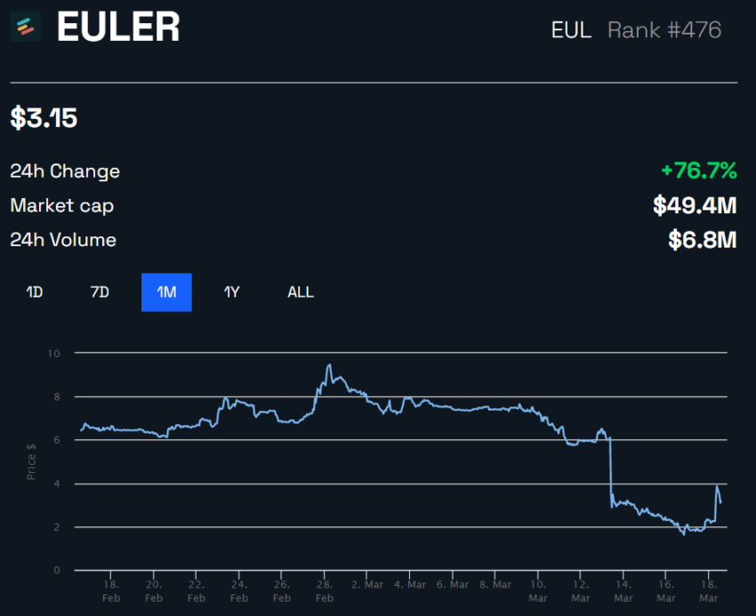 โทเค็น EUL ของ Euler Labs เพิ่มขึ้นมากกว่า 76% ใน 24 ชั่วโมงที่ผ่านมาเป็น 3.15 ดอลลาร์สหรัฐฯ ณ เวลาที่เขียน ตามข้อมูลของ BeInCrypto โทเค็น EUL ลดลงมากกว่า 48% หลังจากการเจาะระบบในวันที่ 13 มีนาคม 2023