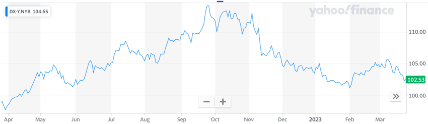 USDX วัดมูลค่าของ USD เทียบกับบรรดาสกุลเงินหลักอื่นๆ และการลดลงของมูลค่าของดอลลาร์สหรับฯ ในช่วง 6 เดือนที่ผ่านมาแสดงให้เห็นว่าเงินดอลลาร์สหรัฐฯ กำลังสูญเสียมูลค่า การลดลงนี้เกิดจากความกลัวว่าจะเกิดภาวะถดถอยเนื่องจากการปรับขึ้นอัตราดอกเบี้ยของ FED และการล่มสลายของธนาคารรายใหญ่ของสหรัฐเมื่อเร็ว ๆ นี้