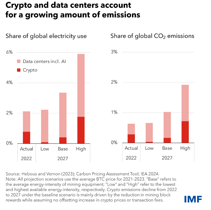 รายงานเน้นย้ําถึงการปล่อยก๊าซคาร์บอนไดออกไซด์ที่เพิ่มขึ้นของอุตสาหกรรมเหล่านี้ ซึ่งรวมกันคิดเป็น 2% ของความต้องการไฟฟ้าทั่วโลกในปี 2022 การคาดการณ์ชี้ให้เห็นว่าสิ่งนี้อาจเพิ่มขึ้นเป็น 3.5% ภายในปี 2025 จากข้อมูลของ IMF ตัวเลขนี้ “เทียบเท่ากับการบริโภคในปัจจุบันของญี่ปุ่น” ซึ่งเป็น “ผู้ใช้ไฟฟ้ารายใหญ่เป็นอันดับห้าของโลก”