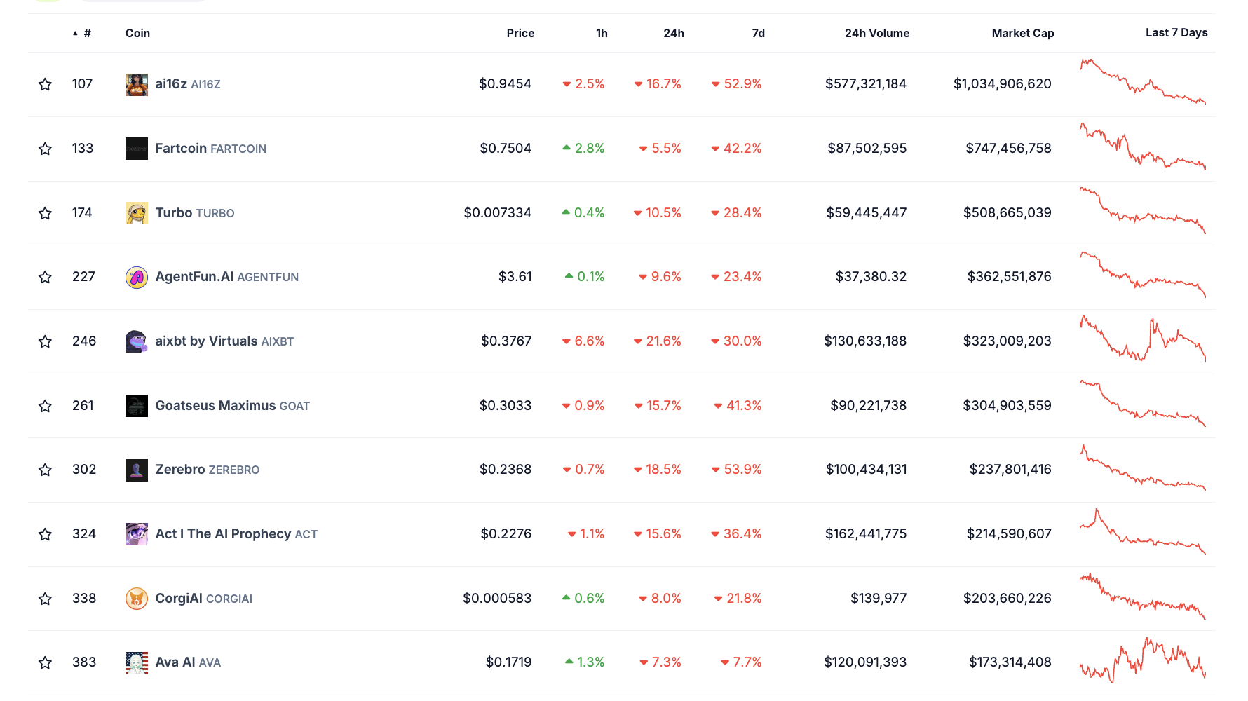 ตามข้อมูลจาก CoinGecko AI Memecoins ปัจจุบันมีมูลค่าตลาดกว่า 5.8 พันล้านดอลลาร์ โดยมีปริมาณการซื้อขายใน 24 ชั่วโมงกว่า 1.7 พันล้านดอลลาร์ ปัจจุบัน Memecoins AI ที่กำลังเป็นที่นิยม ได้แก่ ai16z Fartcoin และ Turbo ในบรรดาผู้ที่ทำกำไรสูงสุดในสัปดาห์นี้คือ President.exe WibWob และ Hentai ของ Truth Terminal