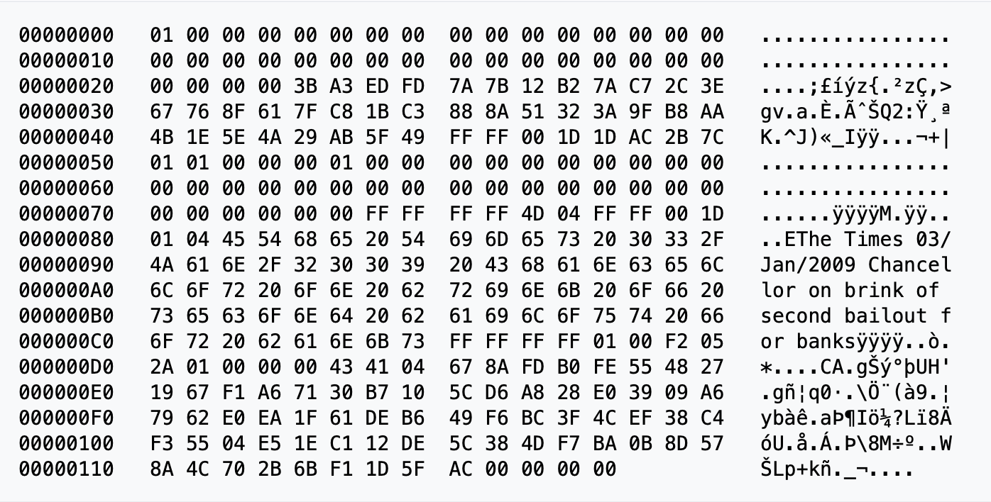 ในบล็อกนี้มีข้อความจาก The Times ว่า “The Times 03/Jan/2009 Chancellor on brink of second bailout for banks” การรวมข้อความนี้เป็นทั้งการบันทึกเวลาและการวิจารณ์ระบบการเงินแบบดั้งเดิม เน้นย้ำถึงเป้าหมายของบิทคอยน์ในการกระจายอำนาจของเงิน