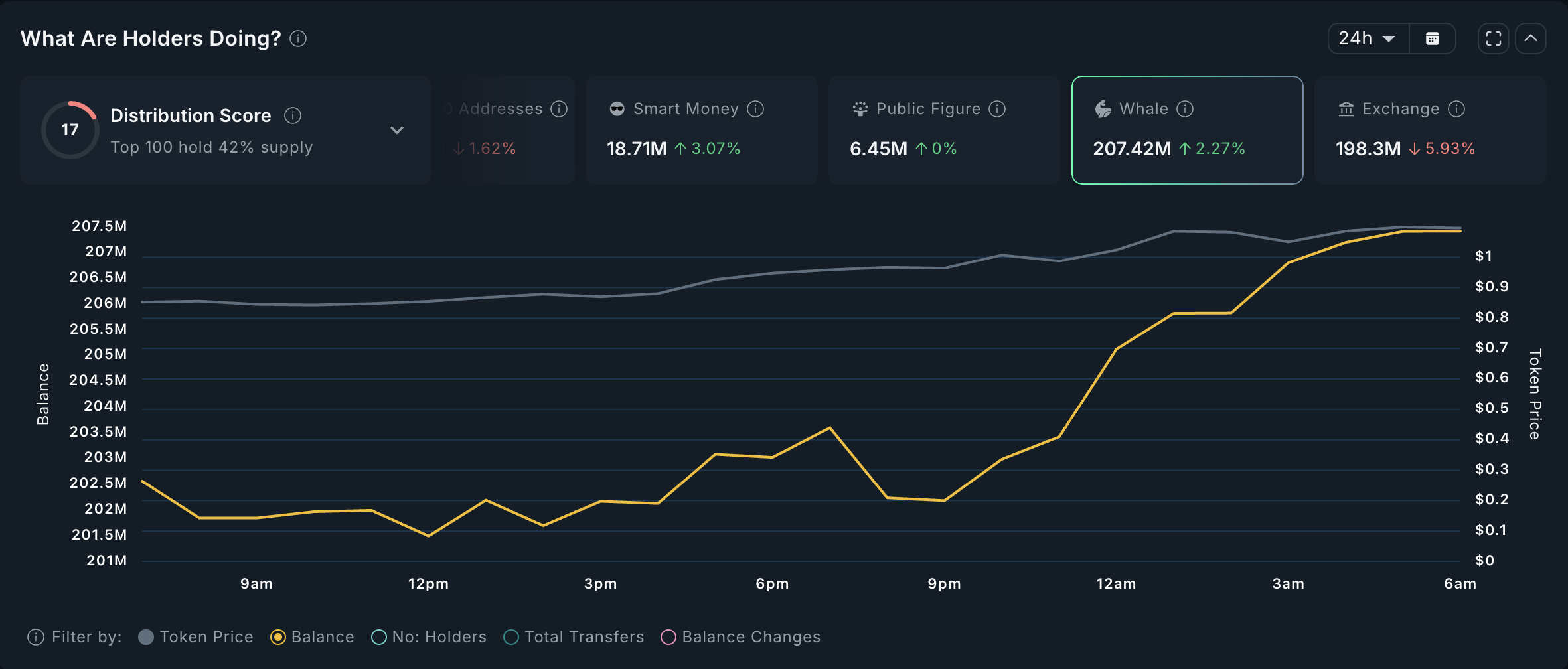 นอกเหนือจากการเพิ่มขึ้นจากความเชื่อมั่นของตลาดที่กว้างขึ้นในช่วง 24 ชั่วโมงที่ผ่านมา ข้อมูลจาก Nansen ระบุว่ากิจกรรมของผู้ถือครองรายใหญ่ที่สุดได้มีส่วนช่วยให้ FARTCOIN พุ่งขึ้นเป็นเลขสองหลัก