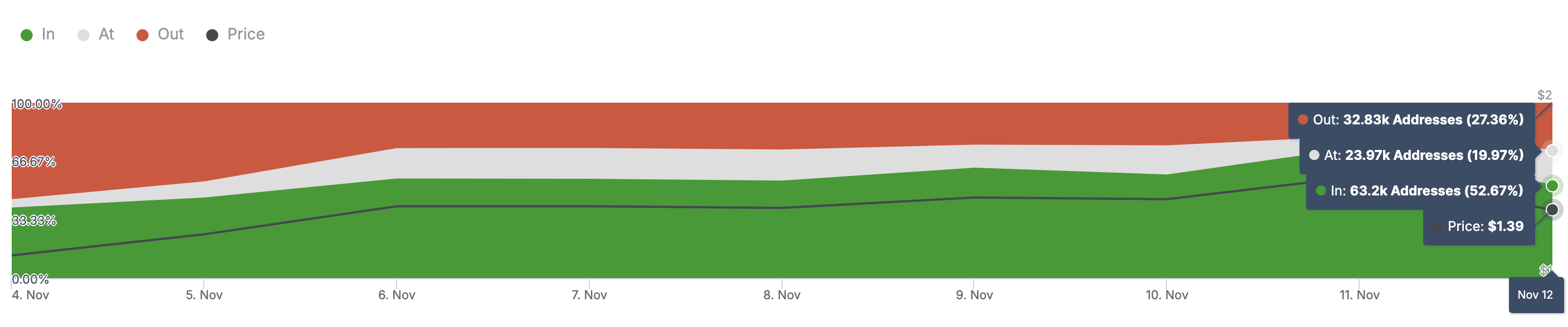 ในวันที่ 11 พฤศจิกายน HIOM แสดงว่าประมาณ 74% ของผู้ถือ FET มีกำไร แต่ณ เวลานี้ ตัวเลขนั้นลดลงเหลือประมาณ 53% การลดลงนี้บ่งชี้ว่าผู้เข้าร่วมตลาดอาจไม่ได้รับแรงจูงใจให้ ซื้อ altcoin; ดังนั้น ราคาอาจมีปัญหาในการเพิ่มขึ้น