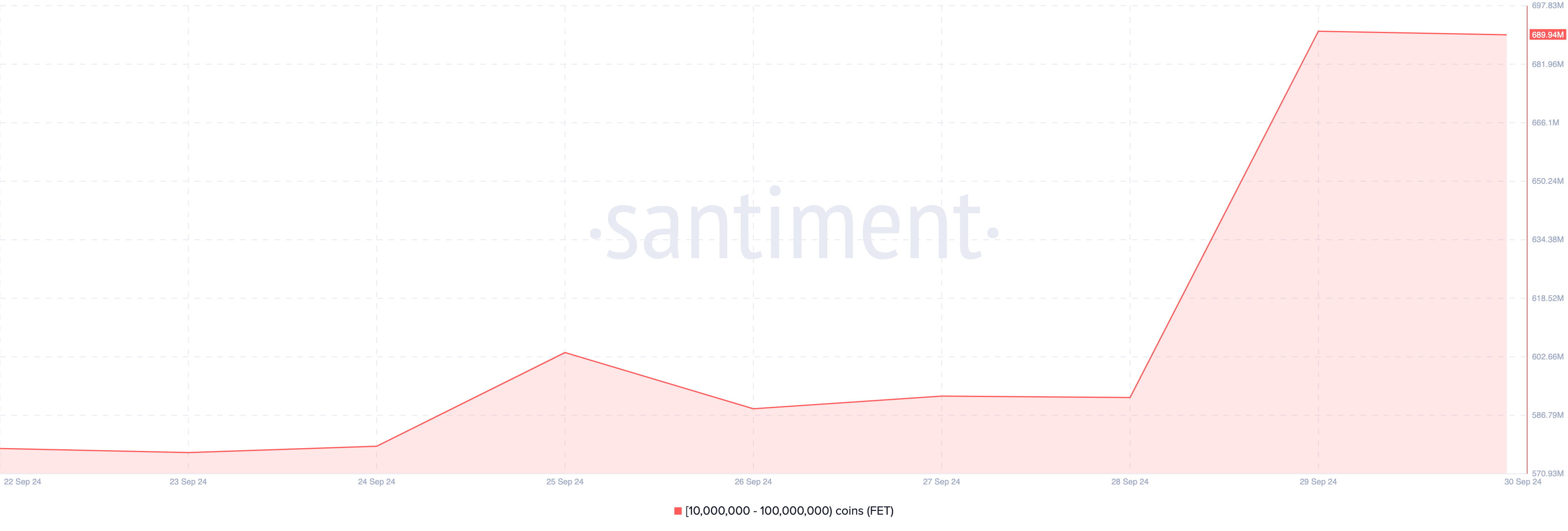 หลังจากการลดลงนั้น ดูเหมือนว่าวาฬคริปโตจะมองเห็นโอกาสในการซื้อในราคาที่ถูกลง ซึ่งเห็นได้จากข้อมูลบนเชนที่ได้มาจาก Santiment ตามข้อมูลของ Santiment จำนวนเหรียญที่ถือโดยที่อยู่ที่มีประมาณ 10 ล้านถึง 100 ล้าน FET อยู่ที่ 591.45 ล้านเหรียญในวันที่ 27 กันยายน