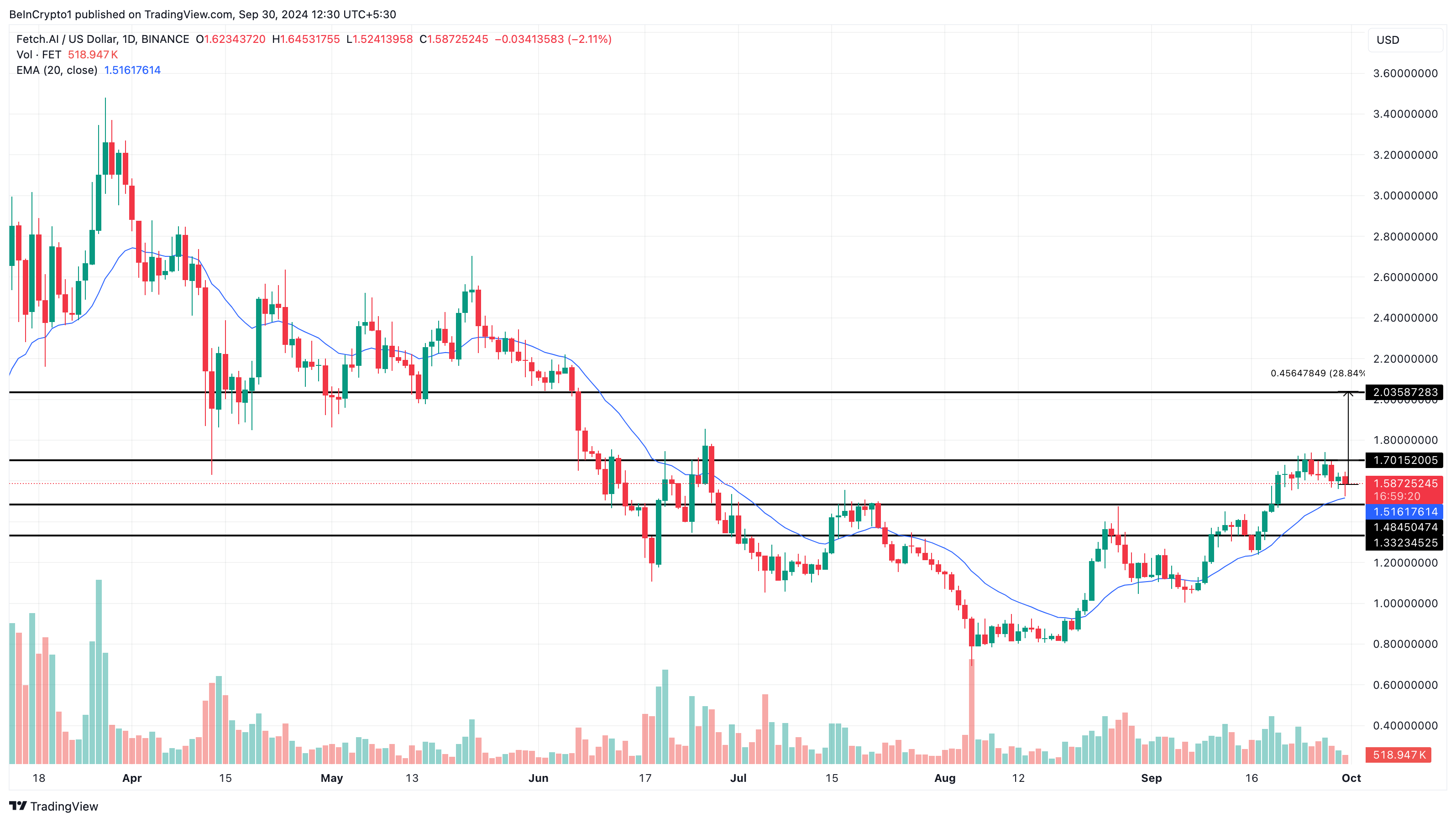 ในวันที่ 25 กันยายน ราคาของ FET พุ่งขึ้น ถึง 1.70 USD ซึ่งทำให้เกิดการคาดการณ์ว่าเหรียญ AI อาจทดสอบราคาที่ 2 USD แต่สุดท้ายไม่เกิดขึ้น เนื่องจากสกุลเงินดิจิทัลนี้ลดลงเหลือ 1.60 USD