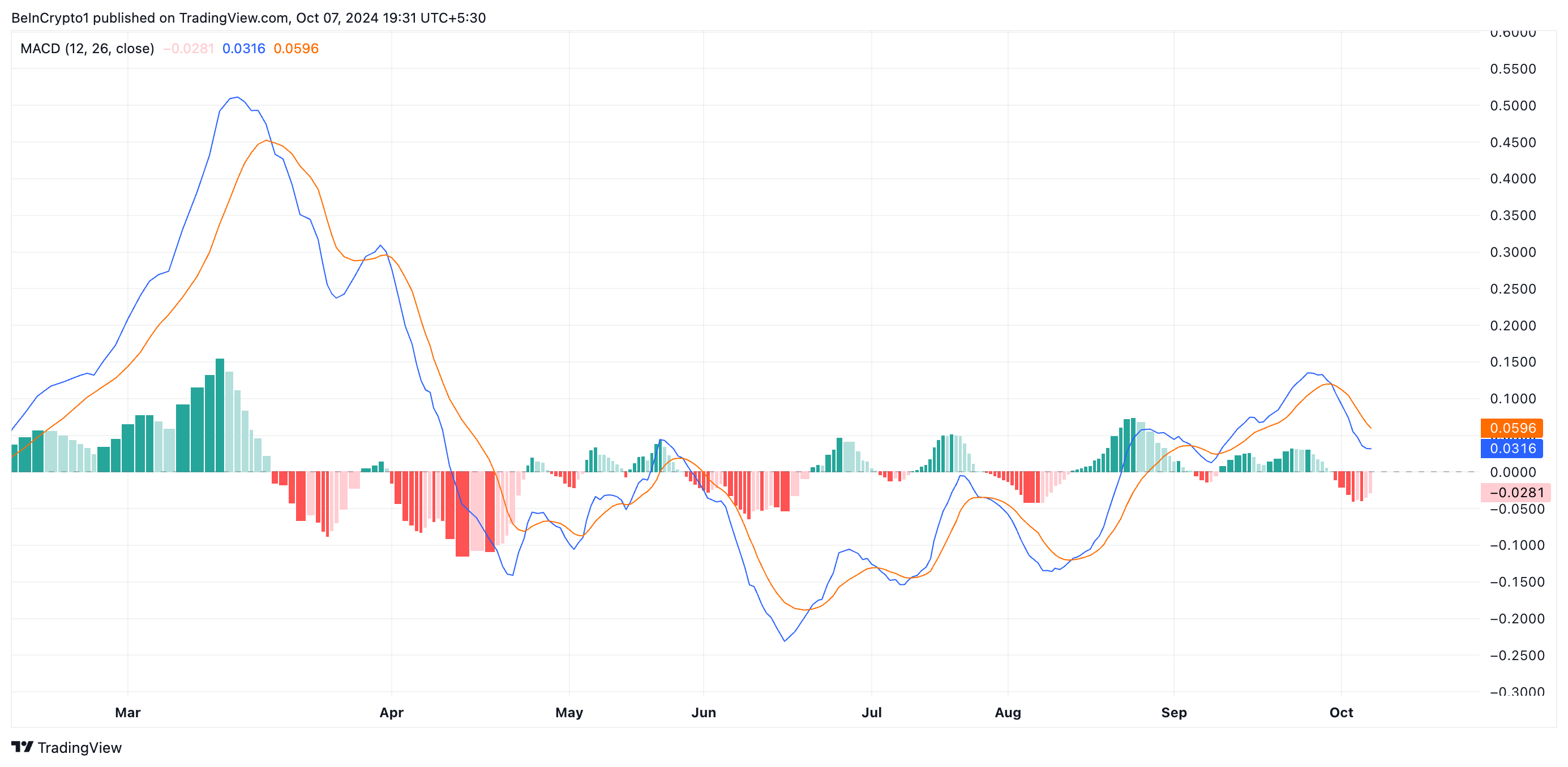 ตัวบ่งชี้การรวมกันของค่าเฉลี่ยเคลื่อนที่และการแยกตัว MACD ของ FET ที่ประเมินจากแผนภูมิหนึ่งวัน ส่งสัญญาณแรงกดขายที่เพิ่มขึ้น ณ เวลานี้ บรรทัด MACD สีน้ำเงินอยู่ต่ำกว่าบรรทัดสัญญาณสีส้มและพร้อมที่จะผ่านเส้นศูนย์