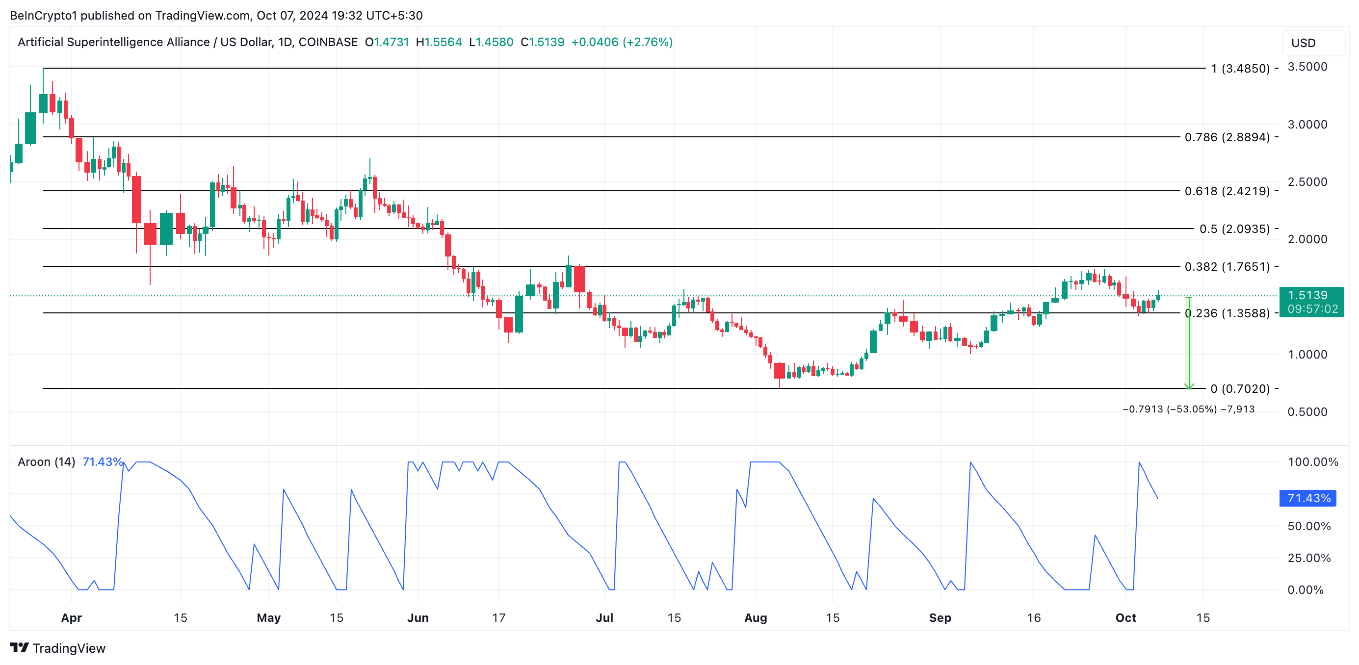 เส้น Aroon Down ของ FET ซึ่งวัดความแข็งแกร่งของแนวโน้มขาลง ยืนยันว่าการลดลงของราคากำลังเพิ่มขึ้น ณ เวลานี้ค่านี้อยู่ที่ 71.43%