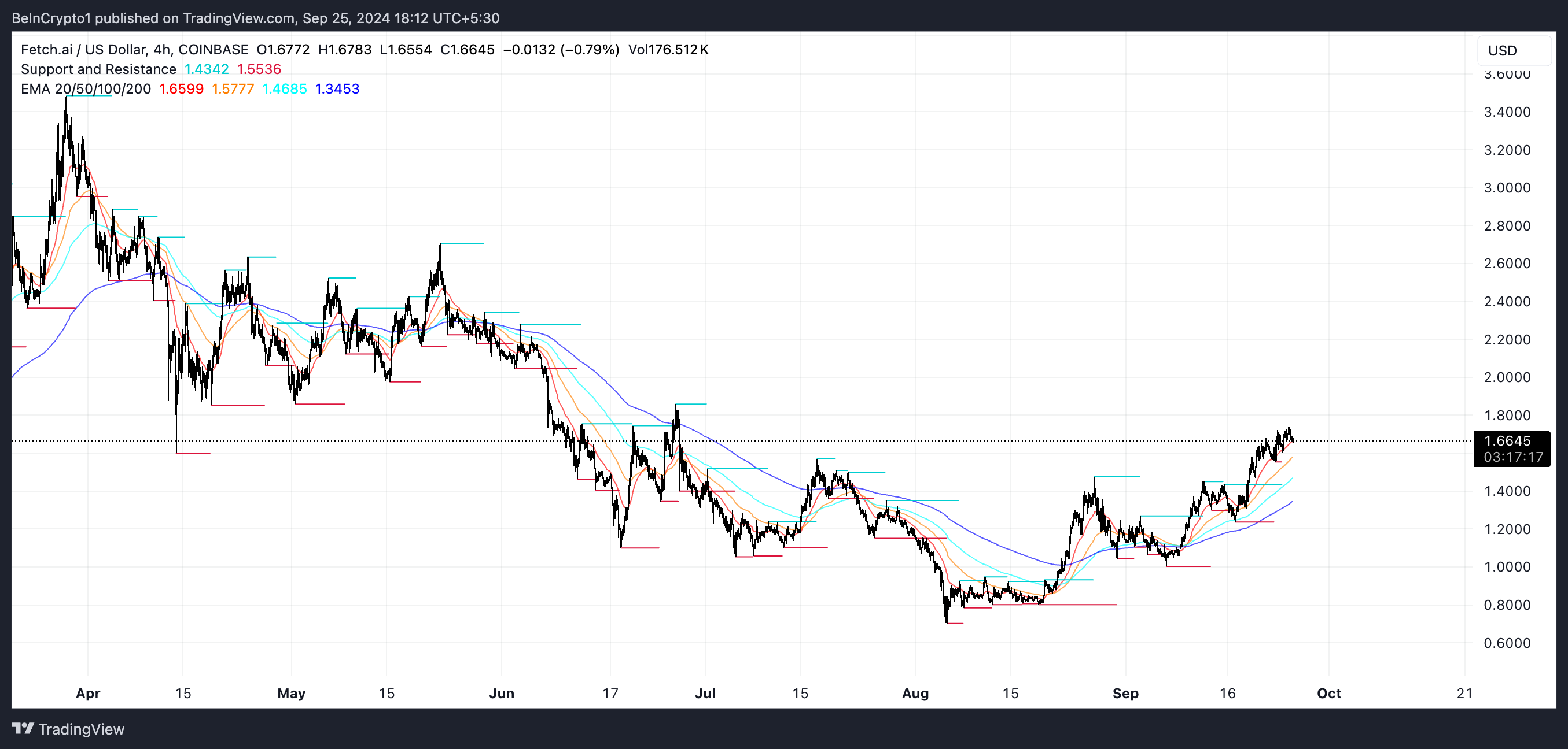 FET ได้สร้างรูปแบบทางเทคนิคที่เป็นกระทิง ที่เรียกว่า golden cross โดยที่ค่าเฉลี่ยเคลื่อนที่เชิงเส้นที่ระยะสั้นข้ามไปเหนือค่าเฉลี่ยเคลื่อนที่เชิงเส้นระยะยาว รูปแบบนี้มักถูกมองว่าเป็นสัญญาณของแรงผลักดันที่เพิ่มขึ้น ซึ่งมักจะตามมาด้วยการเพิ่มขึ้นของราคา ในกรณีของ FET บรรทัด EMA ต่างๆ บนแผนภูมิแสดงการจัดเรียงที่เป็นกระทิง โดยที่ EMAs ระยะสั้นอยู่เหนือระยะยาว
