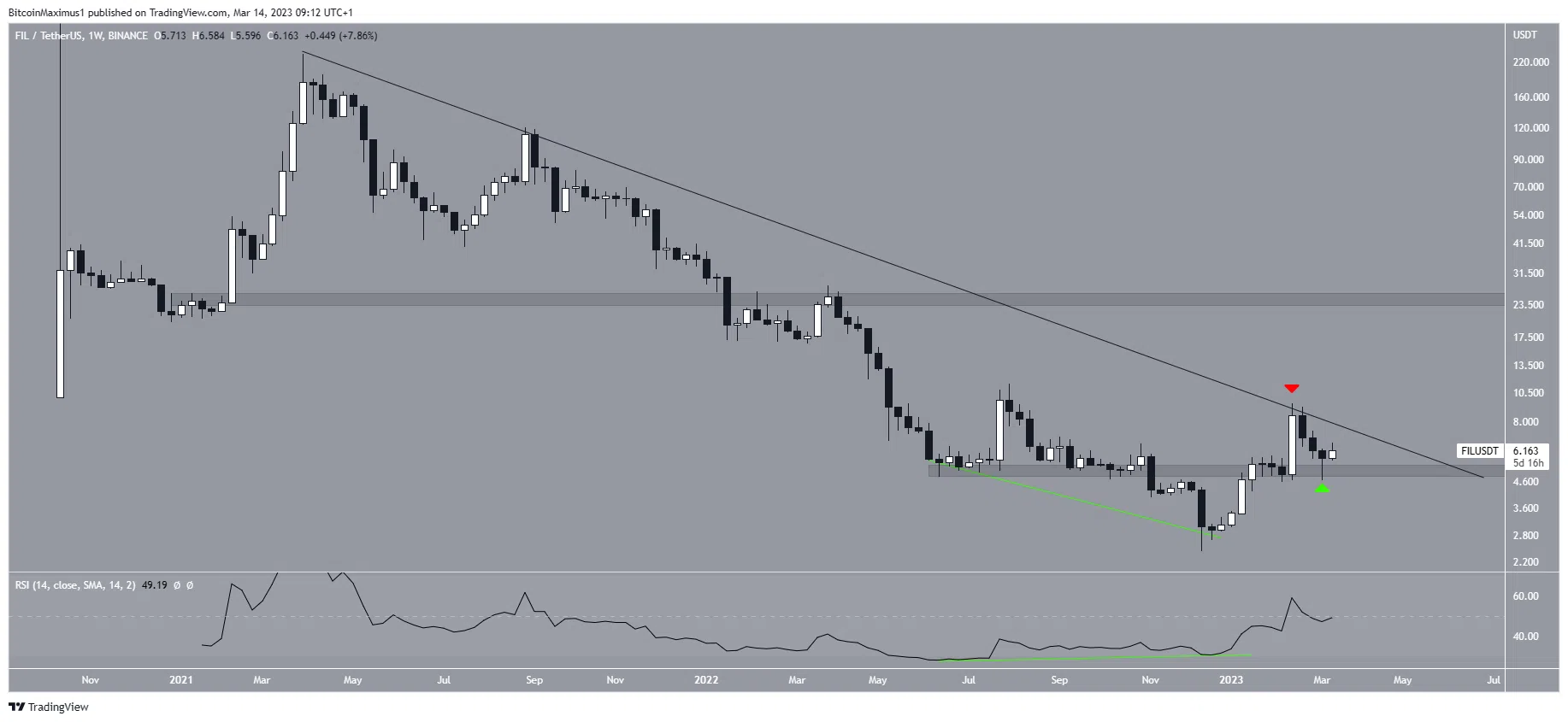 FIL เป็นโทเค็นประจำเครือข่าย Filecoin ซึ่งให้บริการพื้นที่เก็บข้อมูลแบบไร้ตัวกลางควบคุม ทั้งนี้ ราคา FIL ลดลงต่ำกว่าเส้นแนวต้านระยะยาวจากมากไปหาน้อยตั้งแต่เดือนมีนาคม 2021 เมื่อราคาถึงจุดสูงสุดที่โทเค็นเคยไปถึง ที่ 237.73 ดอลลาร์สหรัฐฯ