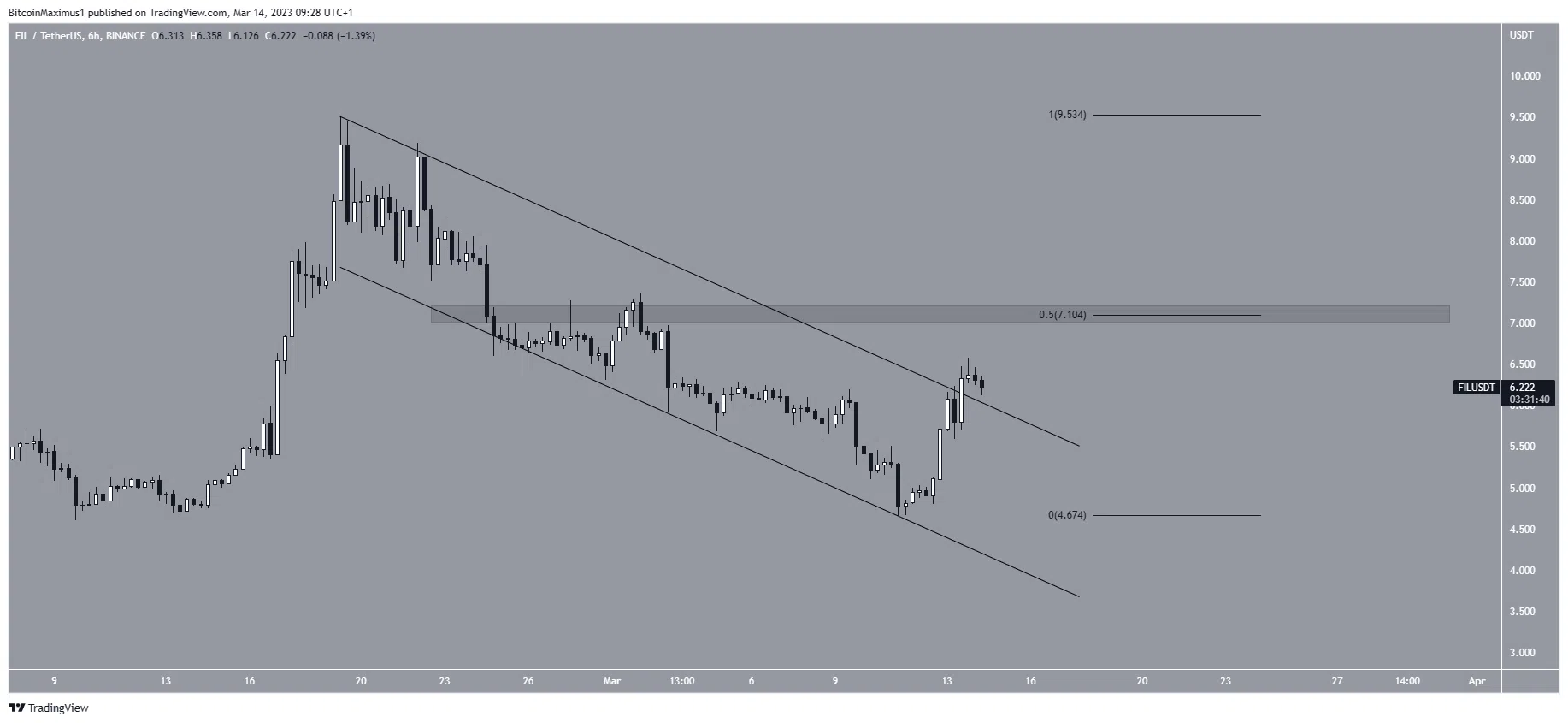 แผนภูมิซึ่งแสดงราคาในช่วงหกชั่วโมงที่ผ่านมาแสดงให้เห็นว่าราคา Filecoin แตกออกจากช่องทางคู่ขนานจากมากไปน้อย เนื่องจากช่องสัญญาณดังกล่าวมักจะมีการแก้ไข การฝ่าวงล้อมอาจเป็นจุดเริ่มต้นของการเคลื่อนไหวขาขึ้นครั้งใหม่ พื้นที่แนวต้านเส้นหลักอยู่ที่ระดับราคา 7.10 ดอลลาร์สหรัฐฯ ซึ่งสร้างโดยแนวระดับและแนวต้าน 0.5 Fib Retracement