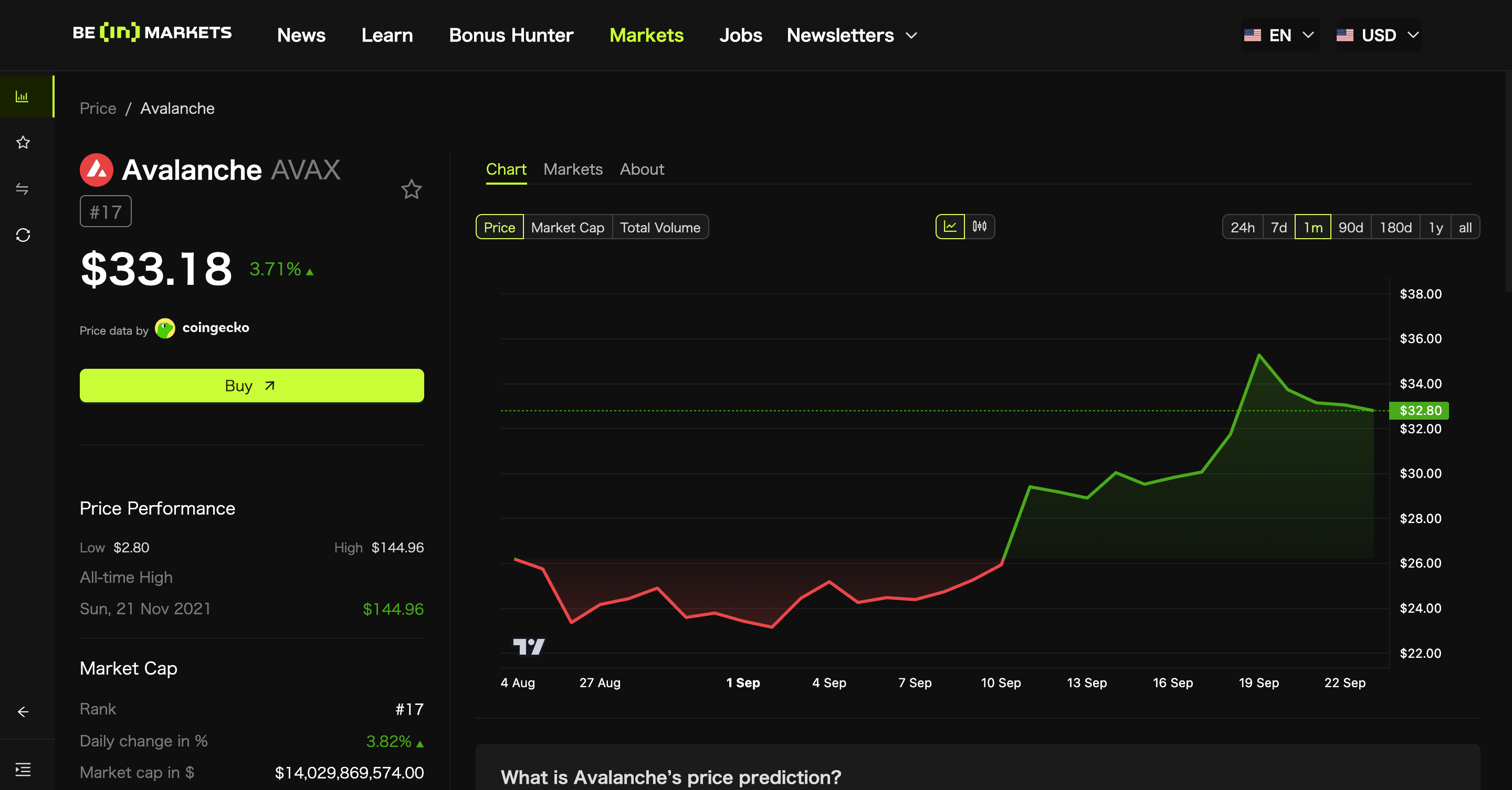ข่าวดีและการริเริ่มเชิงกลยุทธ์ได้ส่งผลต่อประสิทธิภาพของ ตลาด AVAX ด้วยเช่นกัน โดยในช่วงเช้าของวันที่ 23 กันยายน ในช่วงเวลาการซื้อขายของเอเชีย AVAX มีการซื้อขายที่ราคา USD 33.18
