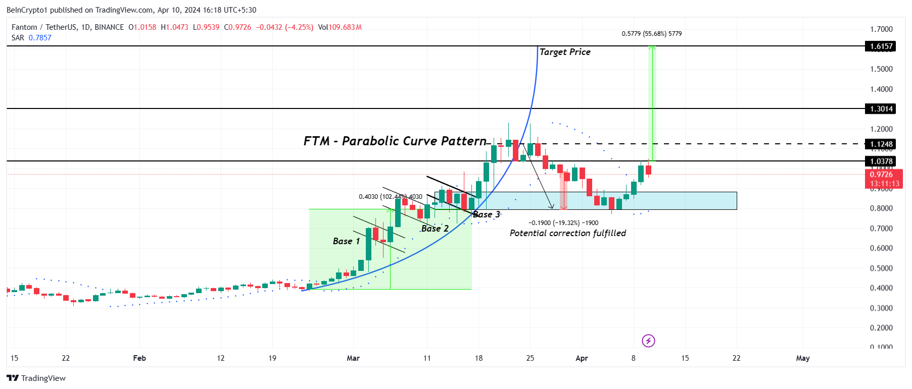 เป้าหมายนี้กําหนดขึ้นโดยรูปแบบ Parabolic Curve ที่ FTM ได้ระบุไว้เมื่อกลางเดือนกุมภาพันธ์ แม้ว่า altcoin จะแก้ไขได้สําเร็จเพื่อทดสอบโซนแนวรับของระดับราคาฐาน 3 แต่ก็ไม่สามารถสร้างแผนภูมิขาขึ้นได้