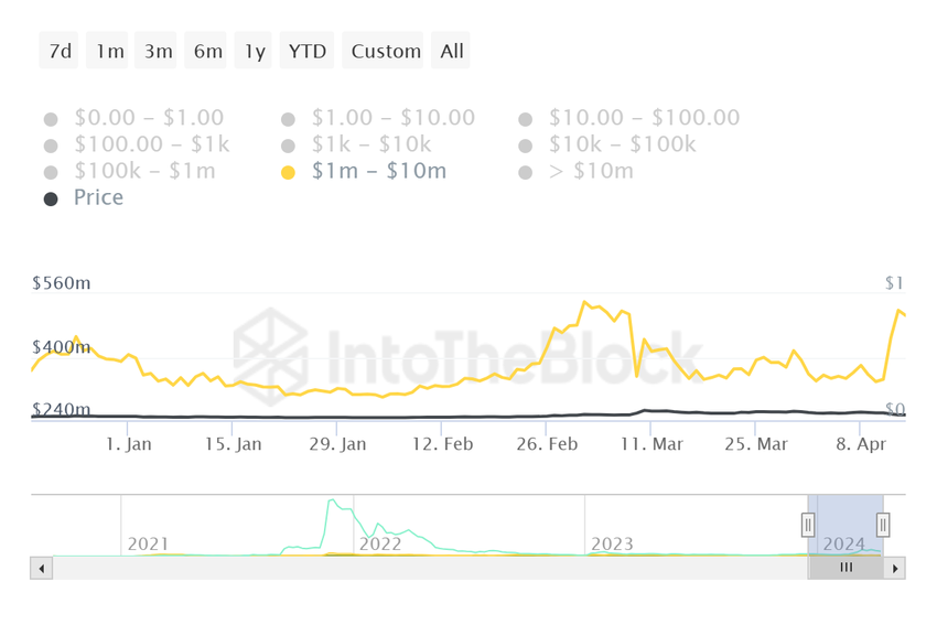 ผู้ถือกระเป๋าเงินขนาดใหญ่เหล่านี้ย้ายไปสะสม GALA มากขึ้นในช่วงเวลาที่ราคาลดลงแทนที่จะขาย ที่อยู่ที่ถือครองระหว่าง 1 ล้านดอลลาร์ถึง 10 ล้านดอลลาร์ของ GALA ได้เพิ่ม GALA มูลค่า 160 ล้านดอลลาร์เพื่อเพิ่มการถือครองทั้งหมดเป็น 504 ล้านดอลลาร์