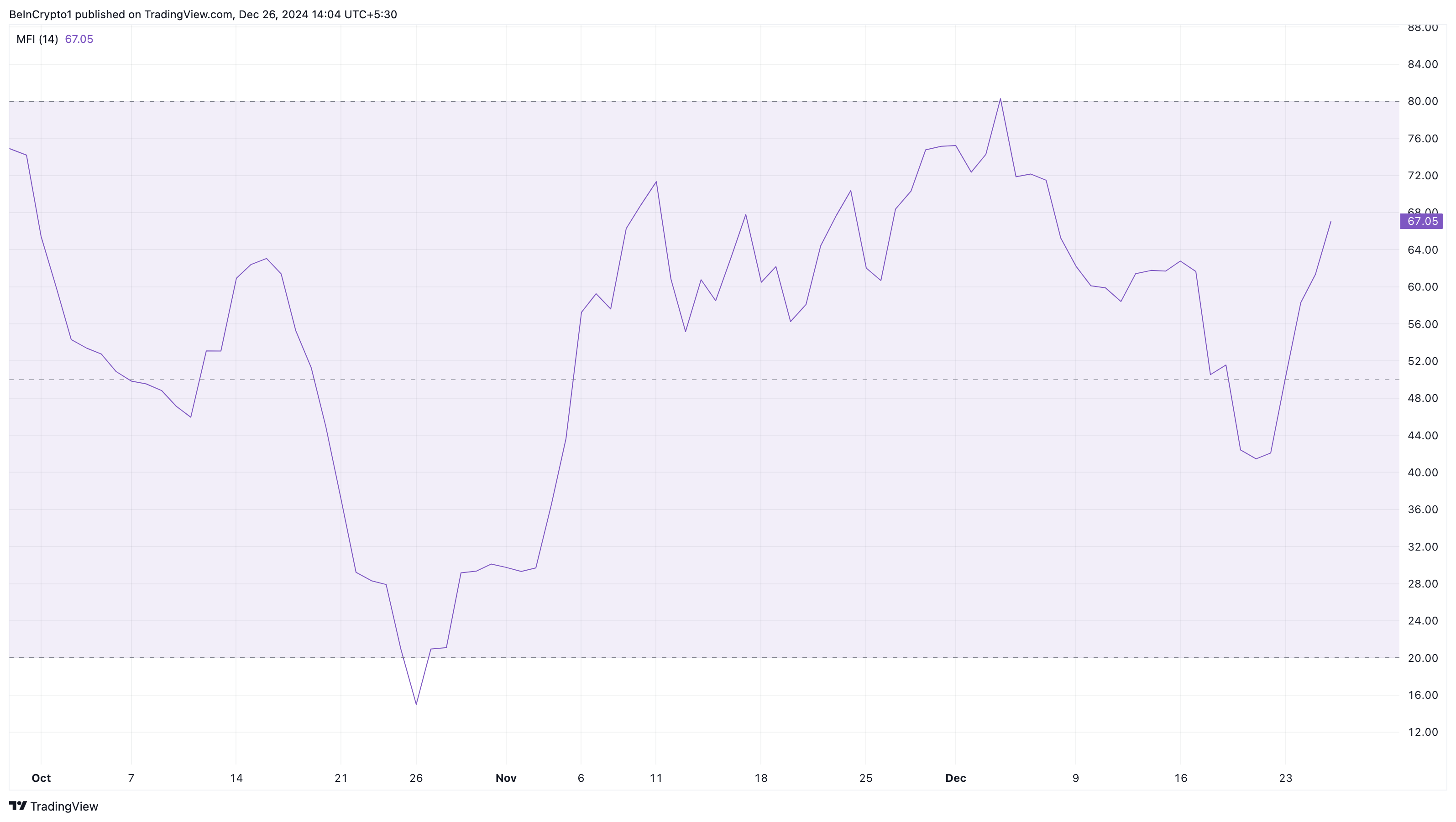 การอ่านค่า MFI ที่สูงกว่า 80 มักจะบ่งบอกถึงสภาวะที่ซื้อมากเกินไป ในขณะที่การอ่านค่าต่ำกว่า 20 บ่งบอกถึงสภาวะที่ขายมากเกินไป อย่างไรก็ตาม ตัวบ่งชี้นี้ยังบอกได้ว่ามีแรงกดดันในการ ซื้อหรือขาย รอบสกุลเงินดิจิทัลในระดับที่ดีหรือไม่
