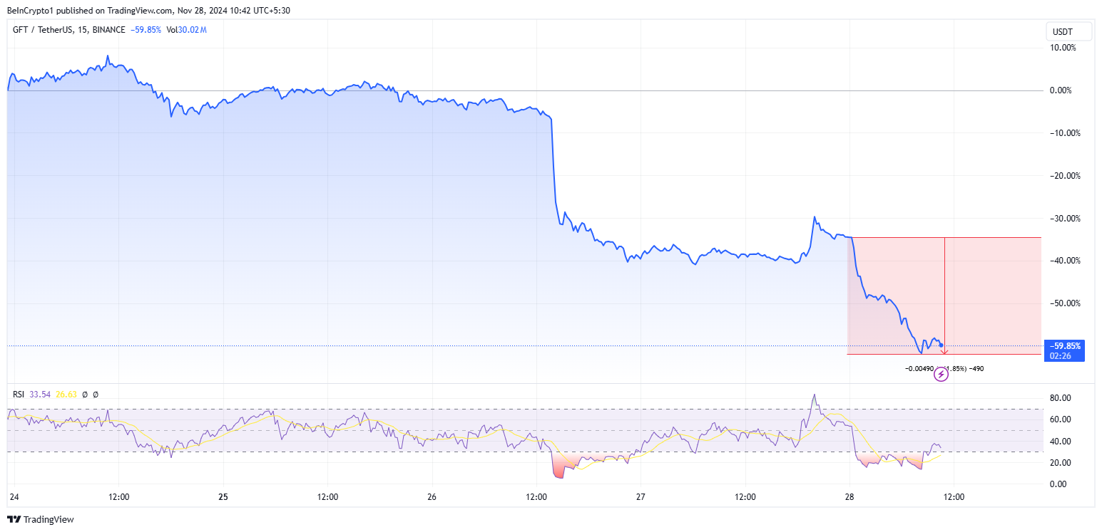 ผลกระทบทันทีจากการประกาศถอดออกของ Binance ในวันอังคารนั้นรวดเร็วและรุนแรง ในสิ่งที่อาจอธิบายได้ว่าเป็นการลดลงอย่างรวดเร็วของความเชื่อมั่นของนักลงทุน ราคาของเหรียญ GFT ลดลงประมาณ 25% การถอดออกจากรายการของตลาดหลักอย่าง Binance มักจะกระตุ้นให้เกิดการขายอย่างตื่นตระหนกเนื่องจากสภาพคล่องและการเข้าถึงสินทรัพย์ลดลง