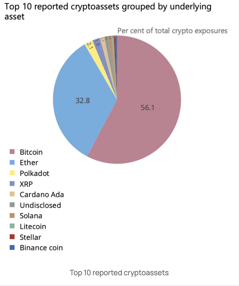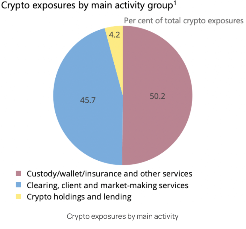 รายงานล่าสุดของคณะกรรมการกำกับดูแลด้านการธนาคารระดับโลกของ Basel ประมาณการว่าธนาคารทั่วโลกเปิดรับ crypto ที่ 0.01% เนื่องจากสถาบันการเงินที่ใหญ่ที่สุด 19 แห่งถือ crypto มูลค่า 9.4 พันล้านยูโร ซึ่งเท่ากับความเสี่ยง 0.14%