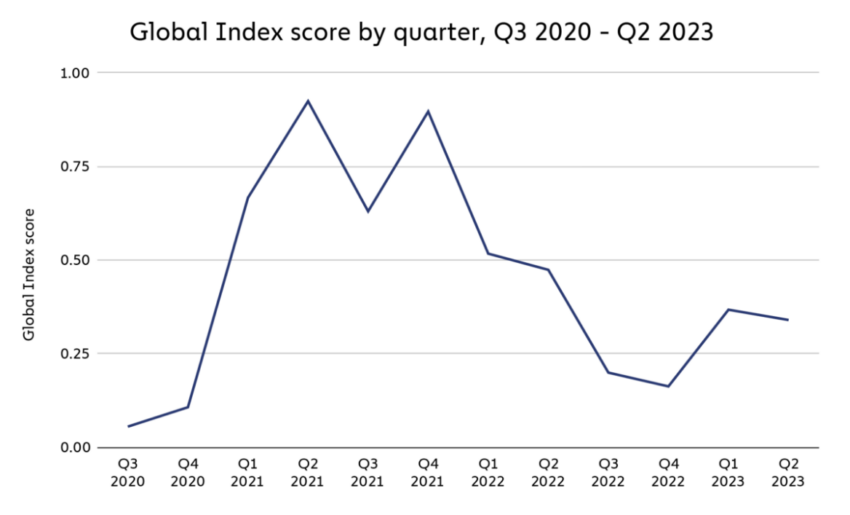ดัชนีนี้ตรวจสอบการใช้งานคริปโตจาก 154 ประเทศบ่งชี้ว่ามีการใช้งานลดลงอย่างเห็นได้ชัดนับตั้งแต่จุดสูงสุดในปี 2021 ถึงกระนั้น เอเชียยังคงเป็นผู้นำระดับโลกในด้านการใช้งานคริปโต
