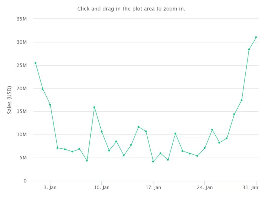 NFT บางส่วนที่มีส่วนช่วยในการบรรลุเป้าหมายของเดือนมกราคม ได้แก่ Bored Ape Yacht Club (BAYC), Mutant Ape Yacht Club (MAYC) และ Axie Infinity