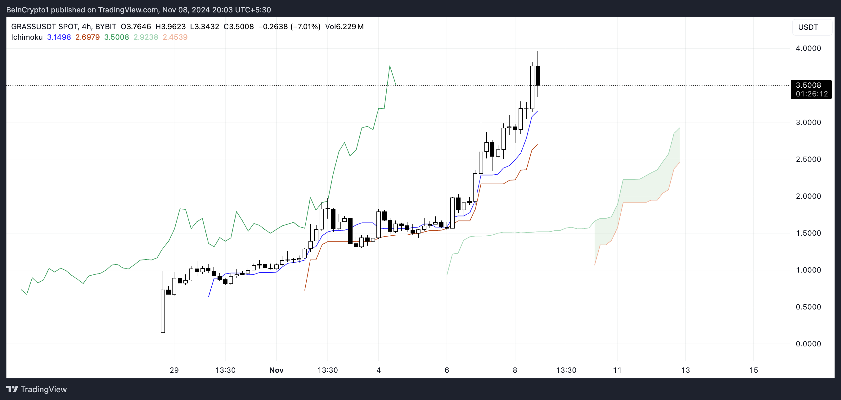 การวิเคราะห์แผนภูมิ Ichimoku Cloud ของ GRASS แสดงให้เห็นว่าราคาอยู่เหนือเมฆอย่างมาก ซึ่งบ่งบอกถึงแรงขับเคลื่อนที่แข็งแกร่งในทางบวก เนื่องจากทั้งระบบนิเวศของ Solana ดูเหมือนจะเติบโตอย่างต่อเนื่อง
