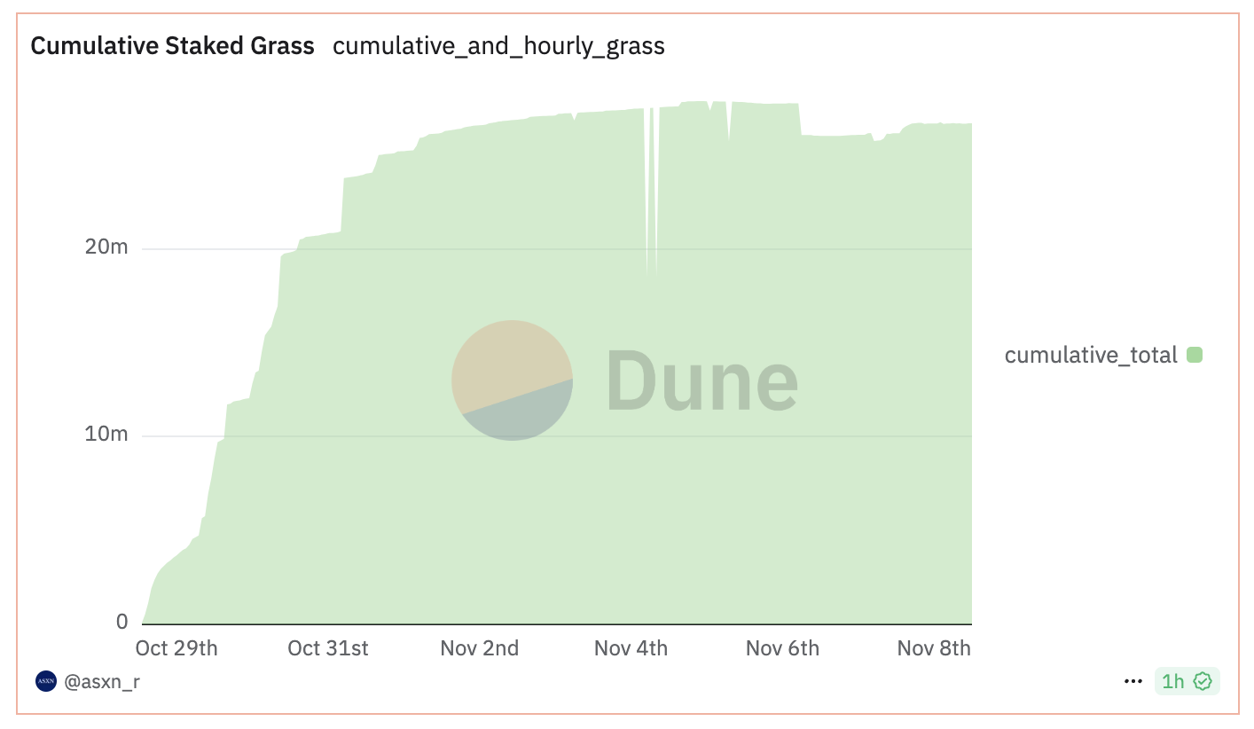 จำนวน GRASS ที่ถูกเก็บไว้มีความเสถียรที่ 26,600,000 ตั้งแต่วันที่ 6 พฤศจิกายน ความเสถียรนี้ตามมาหลังจากที่มีการลดลงเล็กน้อยจากจุดสูงสุดในต้นเดือน ซึ่งบ่งชี้ว่ากิจกรรมการเก็บไว้มีรูปแบบที่สม่ำเสมอ