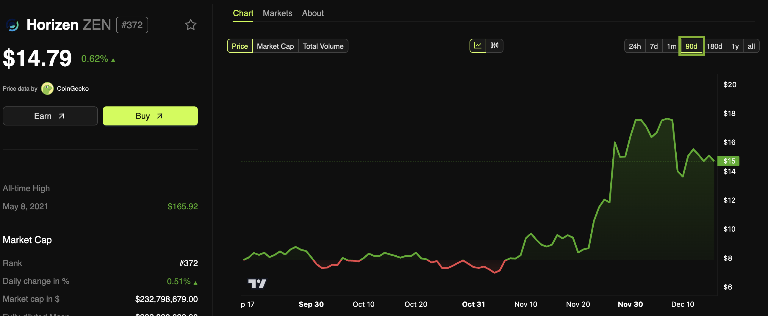 ZEN เป็นโทเค็นที่สามารถขุดได้ซึ่งทำงานบน ระบบ Halving ที่คล้ายกับ Bitcoin มันถึงจุดสูงสุดในปี 2021 เมื่อมันเป็น หนึ่งในผู้ที่ได้กำไรมากที่สุดในวงการ